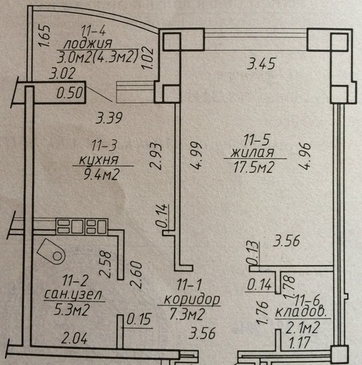 Площадь (общая / жилая / кухни): 44.6 / 17.5 / 9.4 м 2