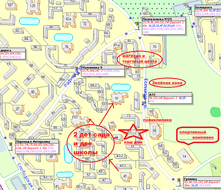 Обжитой район, всё в шаговой доступности: детская и взрослая поликлинника, два детских сада и две школы, спортивный стадион.Неподалёку рынок и супермаркеты, спортивный центр Максима Мирного. Возле дома несколько остановок общественного транспорта, 7 минут и вы на ст.м Малиновка.Рядом выезд на Мкад, а значит, вы сможете без пробок добраться в любую точку Минска.Т.е. если вам что-то необходимо, чтобы это получить, вы потратите 10-20 минут, а в районе с менее развитой инфраструктурой 30-60 минут. Задайте себе вопрос, где вы хотите провести эти 20-40 минут разницы, например, вечером в пятницу. Дома с семьей или в транспорте?